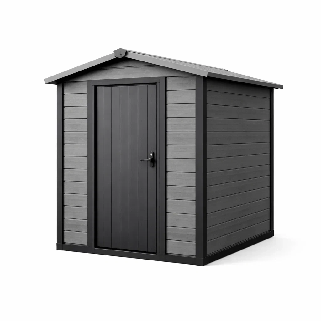 Abri de jardin fabriqué en matériau composite, offrant durabilité et résistance aux intempéries. La porte est équipée d'une serrure sécurisée.
