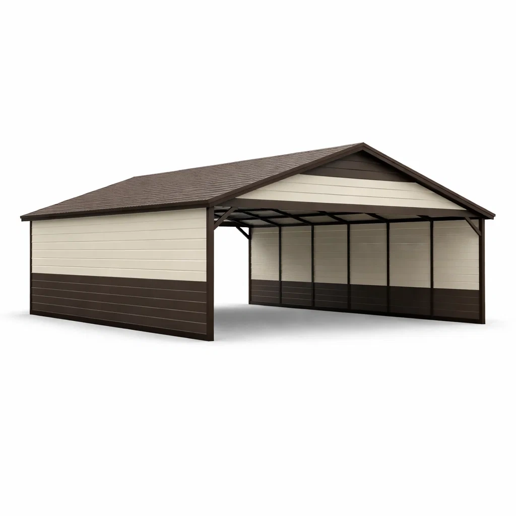 Composants : Structure métallique, panneaux muraux, toit en pente