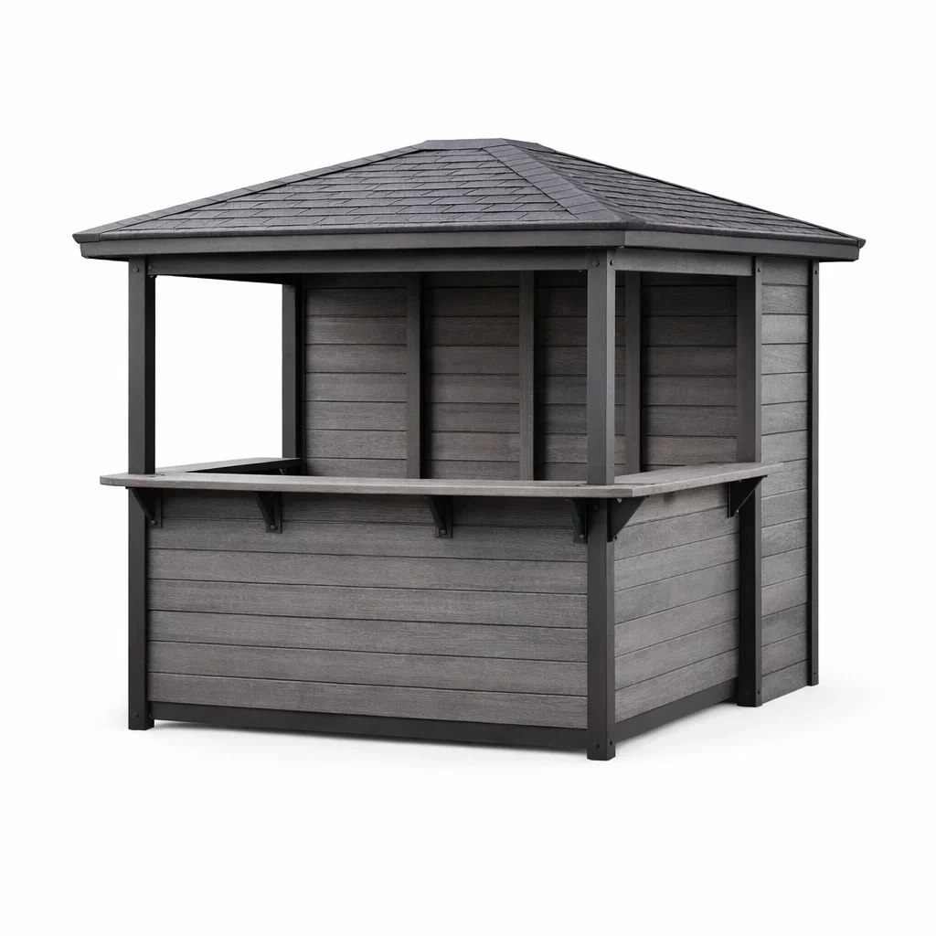 Il est conçu comme un espace de bar extérieur. La structure est en gris avec une surface lisse. Résistant aux intempéries, un nettoyage régulier est recommandé pour l'entretien.