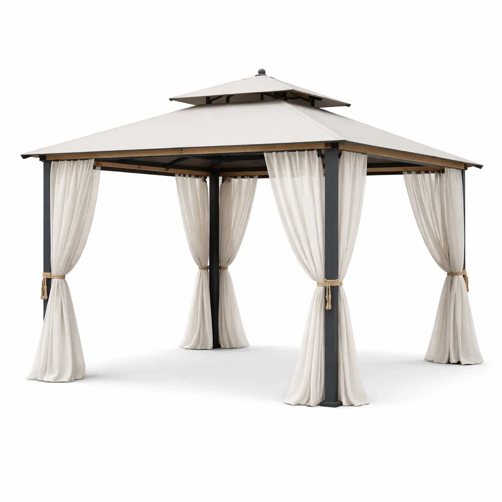 Structure principale en aluminium. Revêtement en toile polyester pour le toit et les rideaux.
